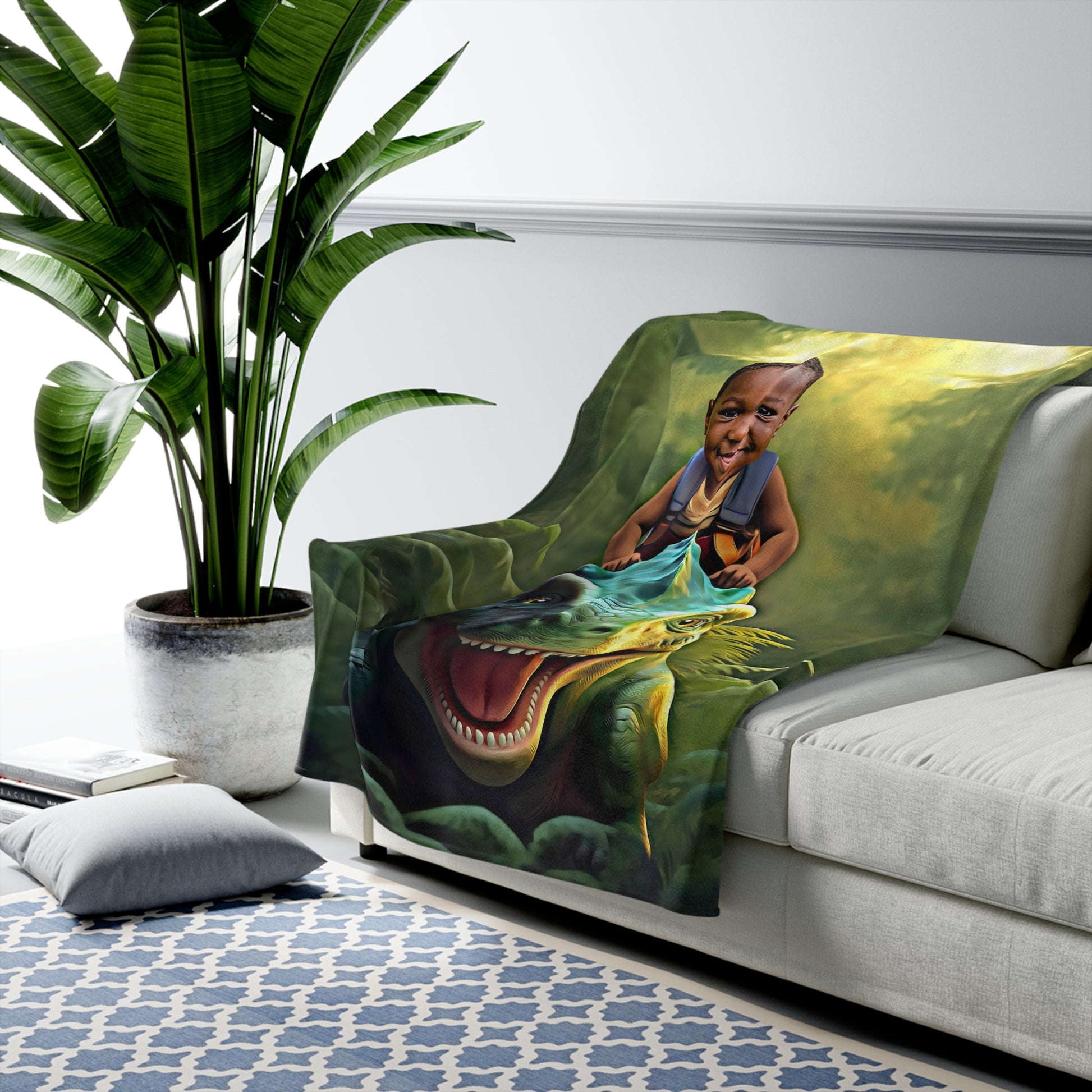 Looking for a unique gift? Give an amazing gift with your kids in the spotlight. Make your kid's dream come to life by showing your love in a fun way with a custom made blanket of 'The Baby T-Rex Rider Blanket'. So realistic that they will think it's real. We place your child (or adult) in his or her dream world.