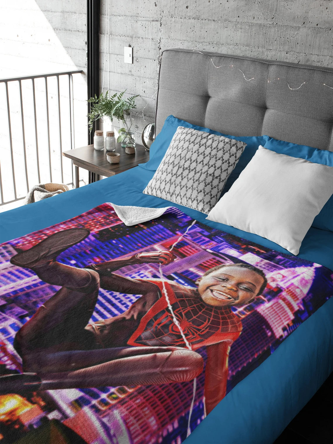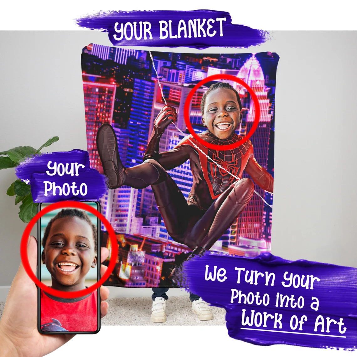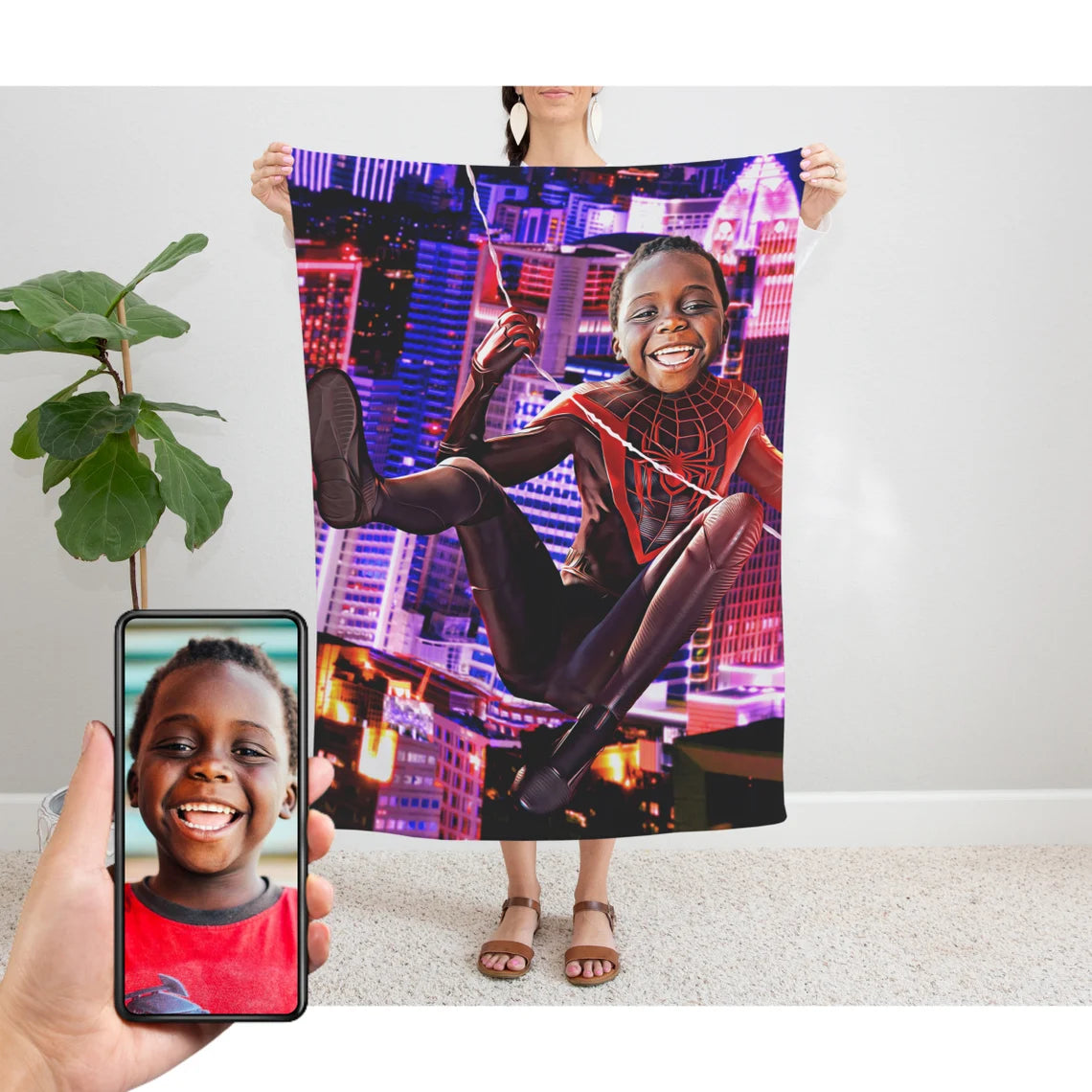 Looking for a unique gift? Give an amazing gift with your kids in the spotlight. Make your kid's dream come to life by showing your love in a fun way with a custom made blanket of 'The Miles Morales'. So realistic that they will think it's real. We place your child (or adult) in his or her dream world.