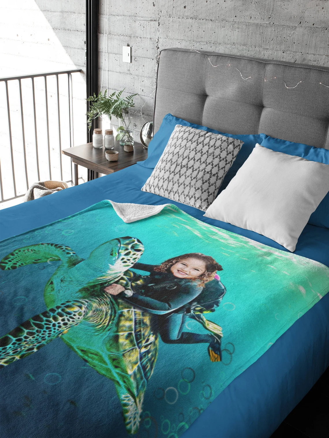 Looking for a unique gift? Give an amazing gift with your kids in the spotlight. Make your kid's dream come to life by showing your love in a fun way with a custom made blanket of 'The Sea Turtle Rider'. So realistic that they will think it's real. We place your child (or adult) in his or her dream world.