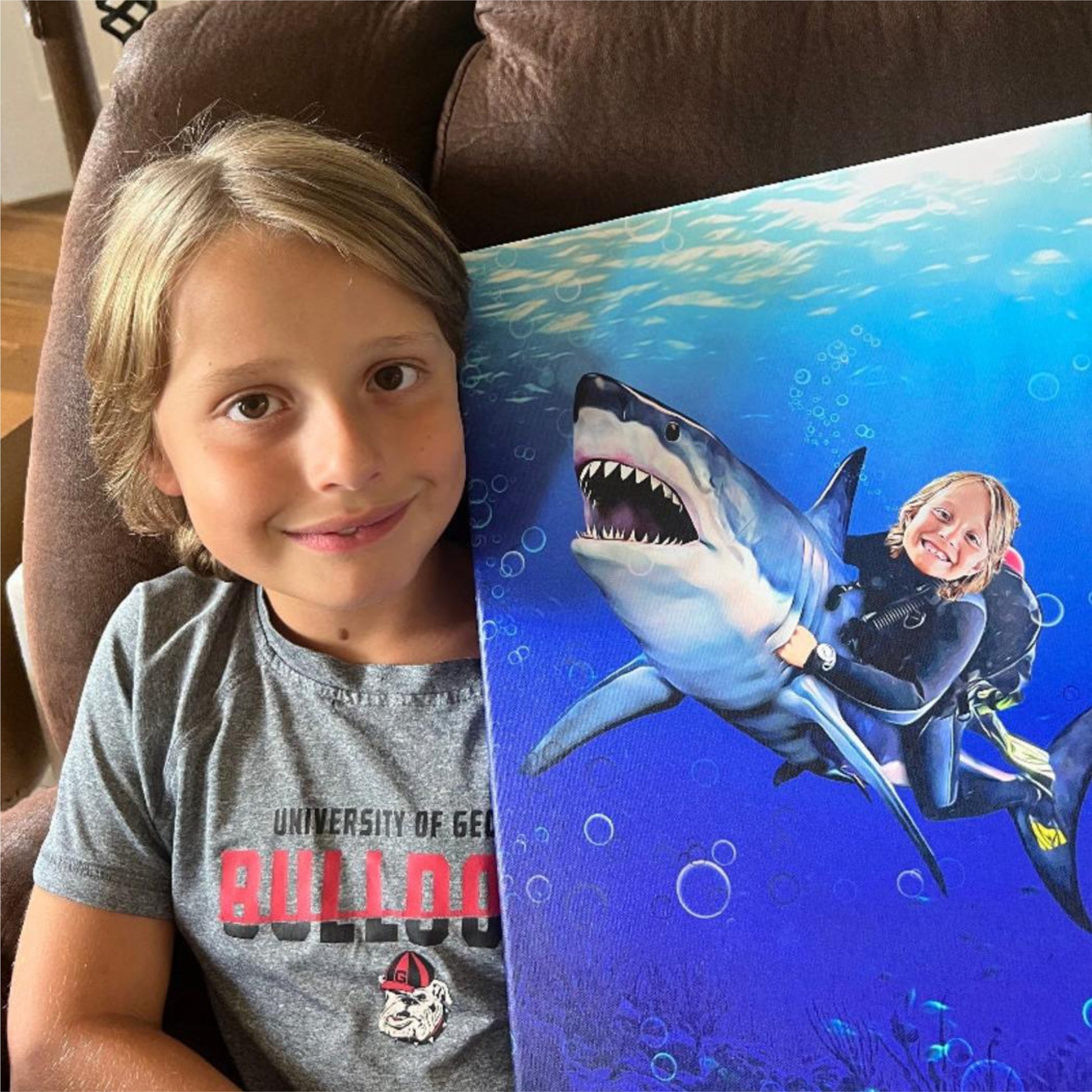 Looking for a unique gift? Give an amazing gift with your kids in the spotlight. Make your kid's dream come to life by showing your love in a fun way with a custom made portrait of 'The Shark Rider'. So realistic that they will think it's real. We place your child (or adult) in his or her dream world.