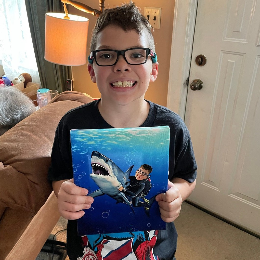 My Son absolutely loved this picture of him riding a shark. He smiles ever time he sees it & was a great birthday present.