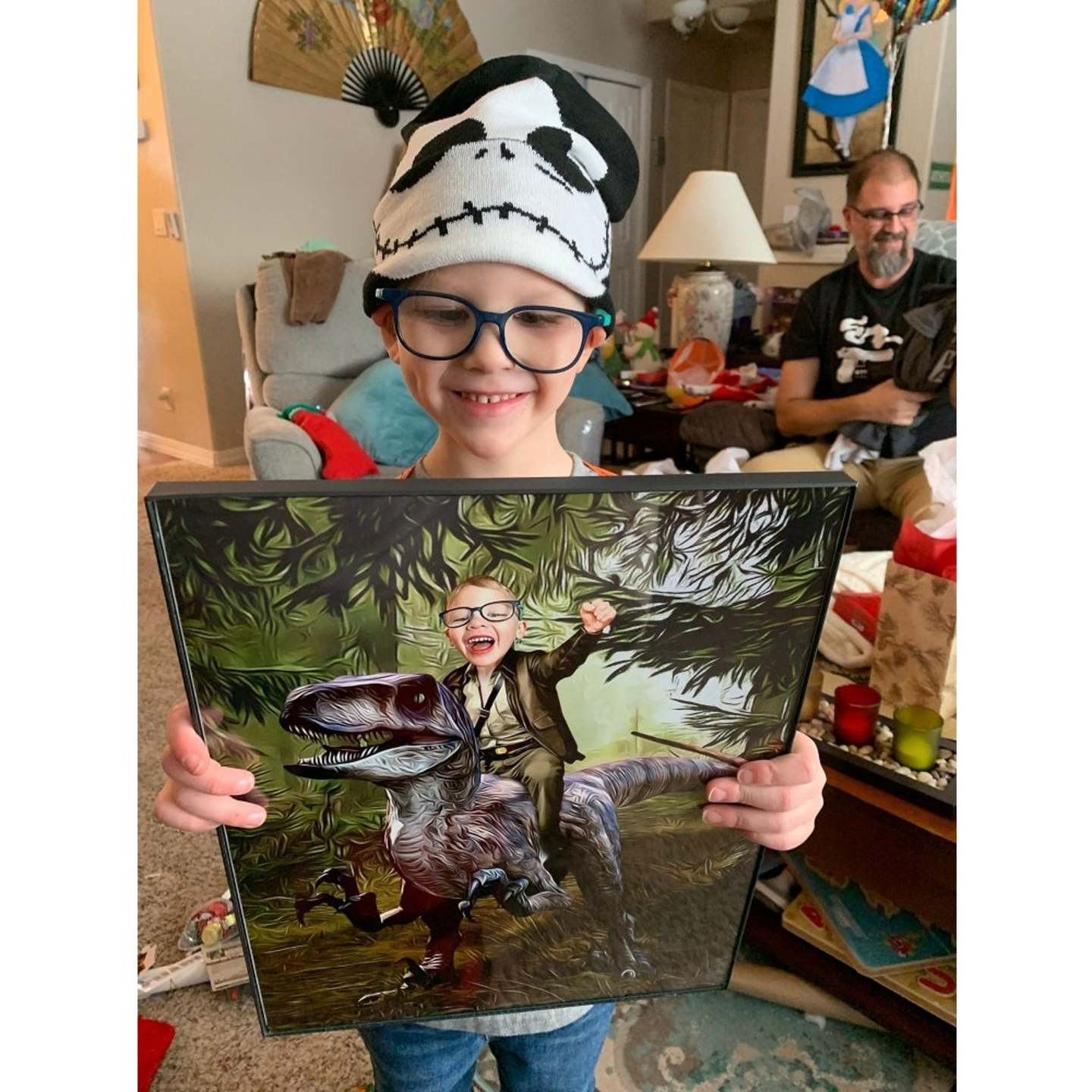 Love this!! Julie was so accommodating when I wanted to change my pictures after she sent the preview photos for my review. I love how the canvas art looks and my grandkids are going to love them when they see themselves riding dinosaurs and unicorns. She was very fast with getting the previews to me and shipping was also quick. I highly recommend ordering from her!